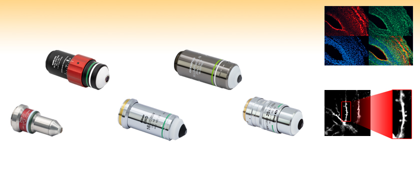 The long working distances (WD) and steep approach angles at the tips of these objectives provide ample space for additional optics or tools such as micromanipulators often used in electrophysiology. The high numerical apertures (NA) of these objectives allow for excitation light to be focused to a small volume, which leads to better axial and lateral resolution. For signal collection, the high NA helps to maximize intensity by capturing photons that are scattered through tissue.