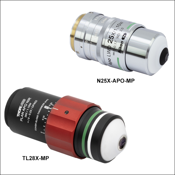 These Apochromatic Water Dipping Objectives provide 25X or 28X magnification and are designed for multiphoton microscopy. Their designation as apochromatic indicates that these objectives provide excellent color correction throughout their defined wavelength ranges including at near-infrared (NIR) wavelengths.