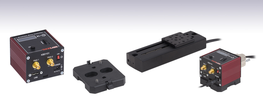 The KBD101 K-Cube® Brushless DC Servo Motor Controller is a part of Thorlabs' new and growing line of high-end, compact motion controllers and is ideal for fast (hundreds of mm/s), high-resolution (10 million encoder counts per second) applications. Designed to provide easy manual and automatic control of brushless DC servo motors, this single-channel driver is capable of driving a variety of rotary and linear brushless 3-phase DC motors with up to 2 A peak coil current. The controller has also been optimized for 'out-of-the-box' operation with Thorlabs' brushless DC servo motor equipped stages, such as the DDS050 and DDS100 fast translation stages. When paired with these stages, speeds up to 500 mm/s can be achieved. The highly flexible software settings and closed-loop tuning support operation with a wide range of third-party DC servo motors and associated stages and actuators.