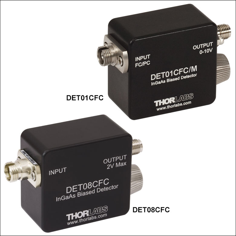 Thorlabs offers a variety of fiber-coupled, high-speed, high-bandwidth photodetectors designed to connect to a single mode or multimode fiber with an FC/PC-terminated input. Together, these detectors are sensitive from the visible to the near infrared (400 - 1700 nm); please see Table 1.2 for the exact spectral range covered by each detector. All detectors shown here feature GHz signal bandwidths and the same ease of use as the rest of our popular DET series. These detectors are designed to perform in test or measurement applications, including research in the fields of data communications, analog microwave, and general high-speed photonics. For comparable detection of free-space radiation, Thorlabs offers high-speed free-space detectors. We also carry a variety of internally biased photodiodes that feature the same ease of use as our fiber-coupled photodetectors but operate at slower speeds. Our biased photodetectors are compatible with our benchtop photodiode amplifier and PMT transimpedance amplifier.