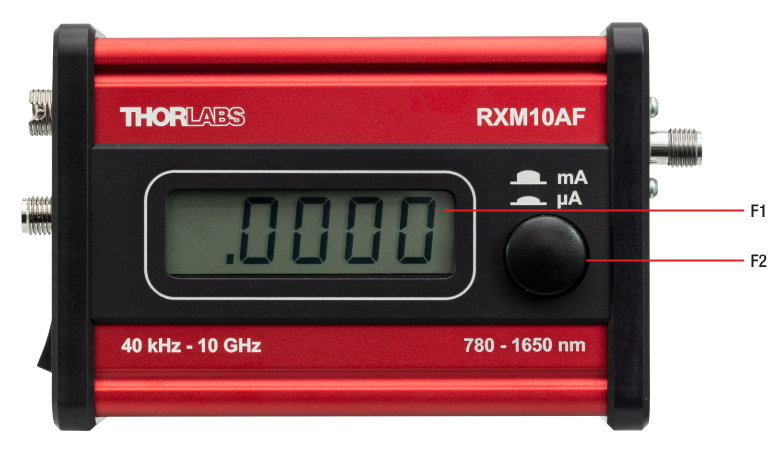 RF signal output(s) are available via female 2.92 mm RF connector(s), except for Item # RXM15EF which provides an inverting RF output through a female SMA connector. The RF output signals can be connected to a measurement instrument using suitable microwave cables or adapters. For differential output devices (25 GHz, 33 GHz, 38 GHz, 40 GHz, and 42 GHz RXM receivers), one input is inverting and the other is non-inverting, and each output is labeled. If only one RF output is being used, the unused port should be capped with a 50 Ω terminator; two are included with each receiver. Both RF ports may also be used simultaneously. Measurements of the DC photocurrent can be viewed using the digital display, and an SMA jack on the input panel provides the analog current monitor output signal. Please see the Operation tab for additional information on functionality and operation.