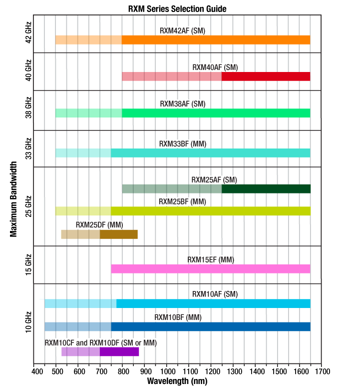 The RXM33BF, RXM38AF and RXM42AF receivers use the same amplifier but different photodiodes. The RXM33BF receiver uses a larger photodiode that is slower and has a lower bandwidth, but makes it possible to couple light from a multimode input fiber. The 38 GHz photoreceiver uses a photodiode which has slightly higher responsivity, but less bandwidth. The RXM42AF receiver uses a photodiode that has higher bandwidth, but less responsivity. The RXM40AF photoreceiver provides a larger output swing than either the RXM38AF or RXM42AF receivers. However, the RXM33BF, RXM38AF and RXM42AF receivers have a smoother frequency response roll-off, lower noise, and less change in frequency response as a function of gain.