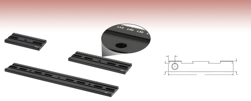 A mounted component can be translated across the entire length of the rail. The XR25DR2, XR25DR, and the XR25DR3 come in lengths of 150 mm, 250 mm, and 500 mm, respectively. For these stages, travel along the rail would be in the direction orthogonal to the stage's translation axis. The graduated scale engraved along one edge of each rail makes it easy to repeat adjustments between multiple locations on the rail; the XR25-RC3 rail carriers can be used to mark a specific location on the rail before moving the stage.
