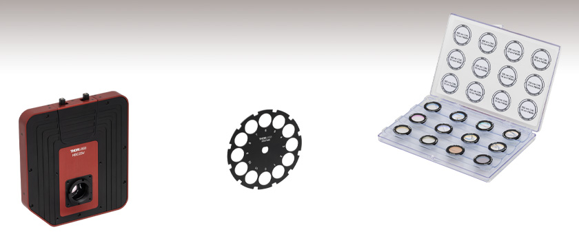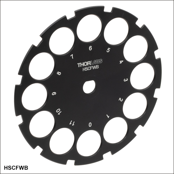 Additional HSCFWB filter wheels are available to make swapping between sets easier, allowing users to capture multispectral images using a wider variety of Thorlabs bandpass filters. The 12-slot wheel can be populated with a pre-configured layout using off-the-shelf filter sets (available separately below) or customized to meet the needs of a user’s particular application.
