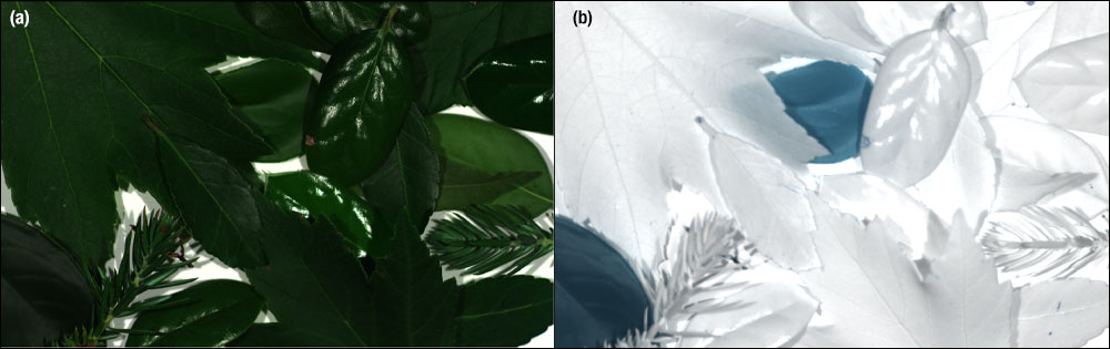 Figure G1.2  Images of foliage using the HSC23V Multispectral Imaging System with 3 different filters to generate an RGB image (a) and the HSC23V Multispectral Imaging System with an 800 nm filter (b). The left image (a) shows the leaves in RGB, where the artificial leaves are indistinguishable from natural leaves, while in the image on the right (b) the artificial leaves can be clearly distinguished (shown in blue).