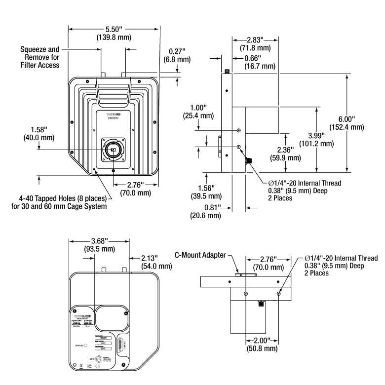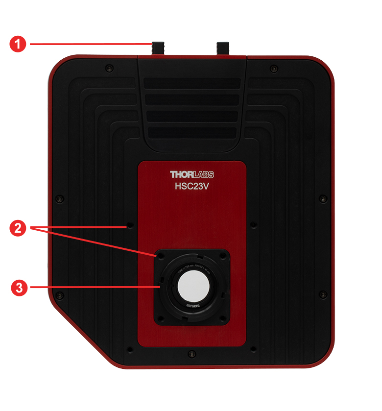 The imaging system can be attached directly to our 30 mm and 60 mm cage systems via the 4-40 mounting holes on the front of the housing. Four 1/4"-20 tapped holes (two on the bottom with a spacing of 2", two on the side with a spacing of 1") on the housing provide compatibility with imperial Ø1/2" Posts, Ø1" Posts and many standard tripod mounts. For more information about mounting the HSC23V imaging system, see the Mounting Options tab.