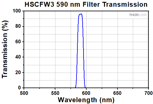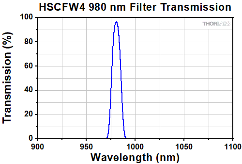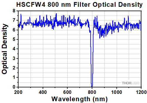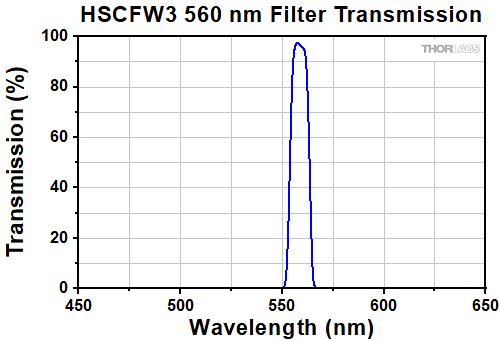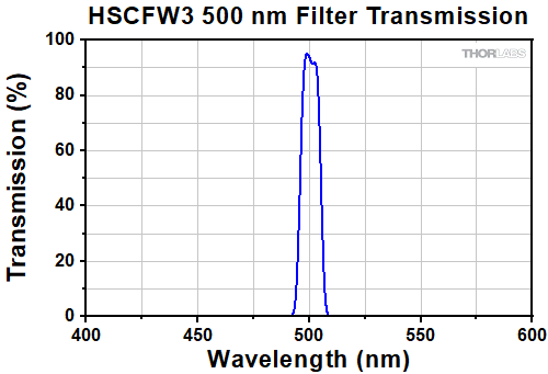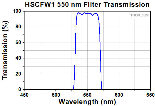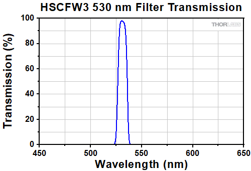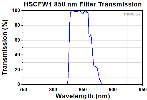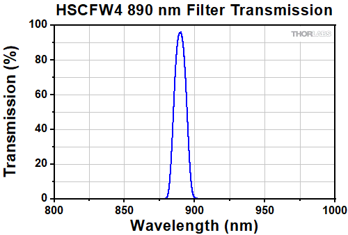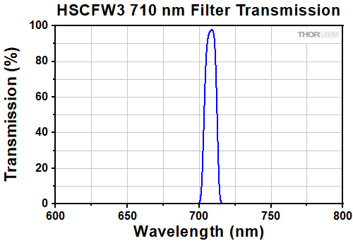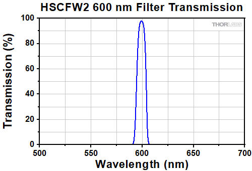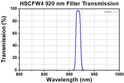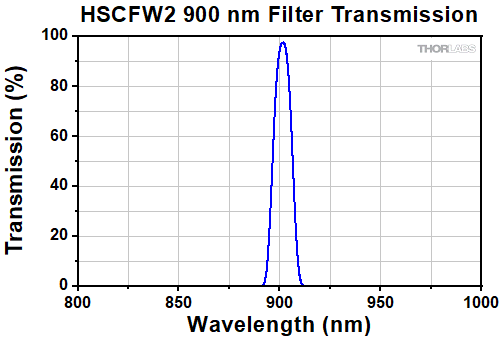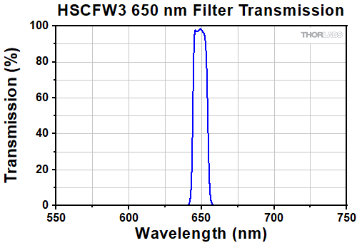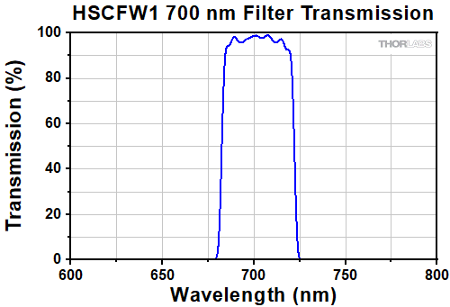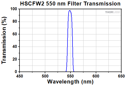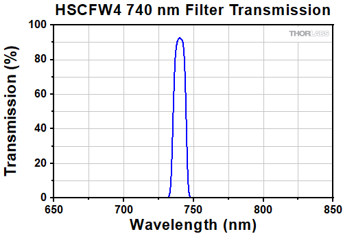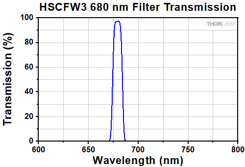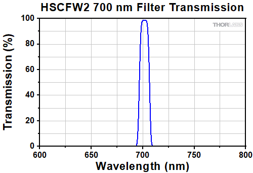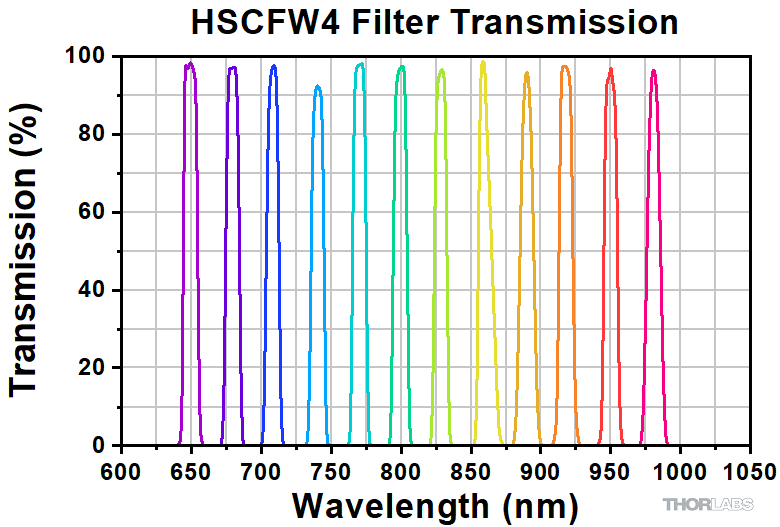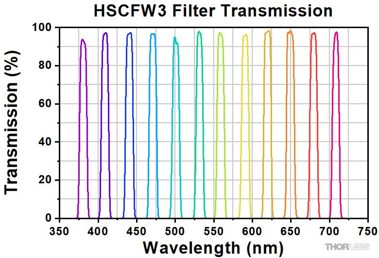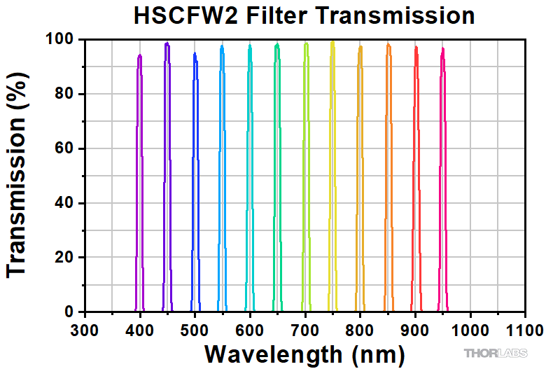 The HSC23V imaging system features a 12-slot filter wheel, that allows customers to tailor their system to their own application. Filter kits are sold separately as sets of twelve (12) filters for various wavelength ranges (VIS, VIS/NIR, or NIR), as well as various full width at half maximum (FWHM) bandwidths. Filters from different kits can be mixed if not all filters are required from a single set to customize the system for a given application. Transmission spectra for the different filter kits can be found in the Filter Graphs tab, while more detailed specifications on each filter may be found below. An extra HSCFWB empty filter wheel may be purchased to make swapping between sets easier.