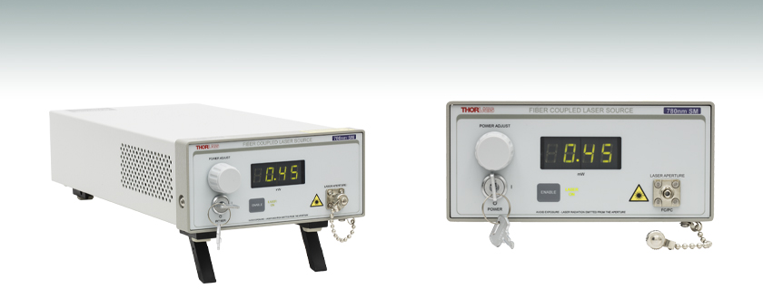 Thorlabs offers single mode and polarization-maintaining fiber-coupled laser sources that emit in the NIR portion of the spectrum. Each benchtop laser source features both a pigtailed Fabry-Perot laser diode and current controller in a single unit.