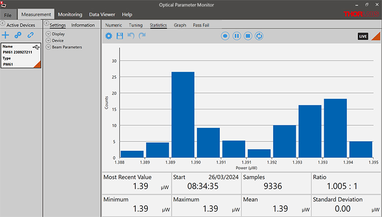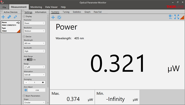 The PM60 and PM61 series power meters can be controlled remotely using Thorlabs' Optical Parameter Monitor (OPM) software. Both series feature a USB 2.0 interface to connect to a PC. Additionally, the PM61 series has a built in Bluetooth module that allows the user to establish a wireless connection to a PC. Remote connectivity allows the user to access the power meter settings, visualize power measurements, and record data directly through the OPM software. Please see the Software tab for details.