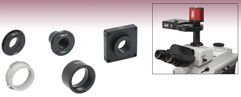 Thorlabs offers adapters to modify the epi-illumination pathway to accept SM threading or a cage system. Adapters with a male Nikon bayonet mount adapt LED light sources and other collimated illumination sources.