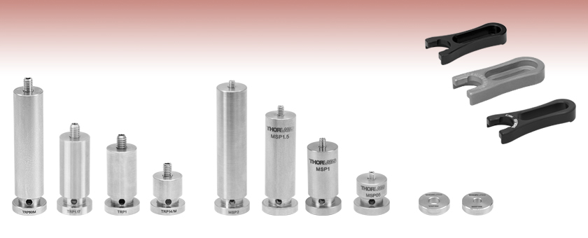 Pedestal posts with 4-40 (M3) taps are directly compatible with our Mini-Series breadboards. Pedestal posts with an 8-32 (M4) setscrew and 1/4"-20 (M6) tap are directly compatible with our 8-32 (M4) and 1/4"-20 (M6) Mini-Series breadboards as well as other breadboards with 1/4"-20 (M6) taps. In addition, the TRP057 (TRP14/M) and TRP1.17 (TRP29/M) posts can be used with many 60 mm cage plates and 30 mm cage plates to position the center of mounted optics 50 mm above the pedestal's mounting surface. This matches the optic height of our Polaris® fixed monolithic mount, a selection of our Polaris mounting posts, and our DIY Cerna® Breadboard Top with Two-Position Slider.