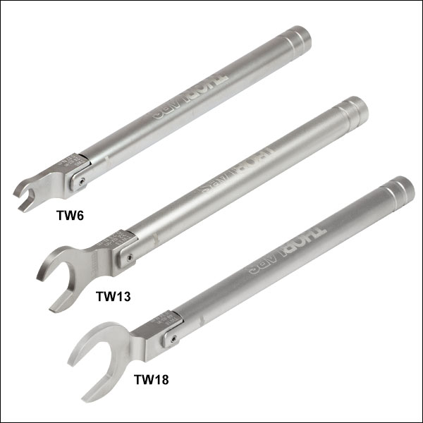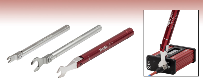 Thorlabs' Torque Wrenches provide preset torque values to consistently secure coaxial connectors, Polaris lock nuts, or other fasteners. When the preset torque value has been achieved, the break-over design will cause the pivoting joint to "break," as shown in the image above. This will prevent further force from being applied to the connector. The wrench's head will move back into place once the force is removed.