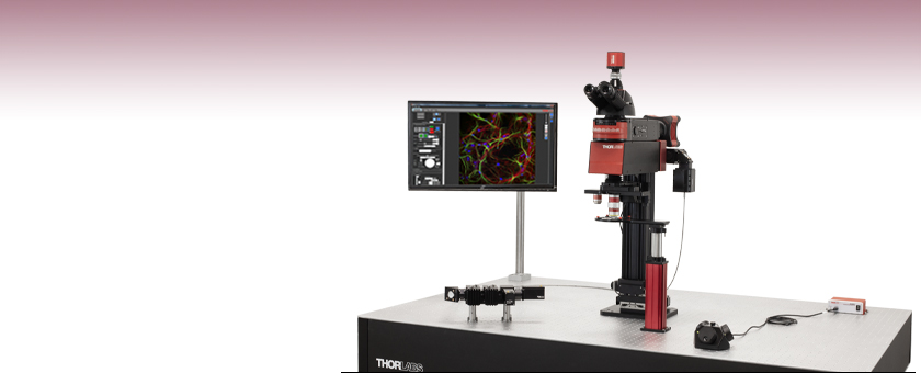 Thorlabs' Upright Confocal Microscopy Systems are complete, fully equipped microscopes available with galvo-galvo or galvo-resonant scan heads to support a variety of imaging applications. By eliminating signals that originate from outside the focal plane, confocal microscopy provides the ability to acquire high-resolution, optically sectioned images from within a thick sample or to reduce background fluorescence from thin cultures. Each system is tailored to meet individual imaging requirements; contact us using the Contact Me button in the green box for additional information and to receive a quote.