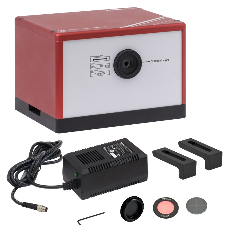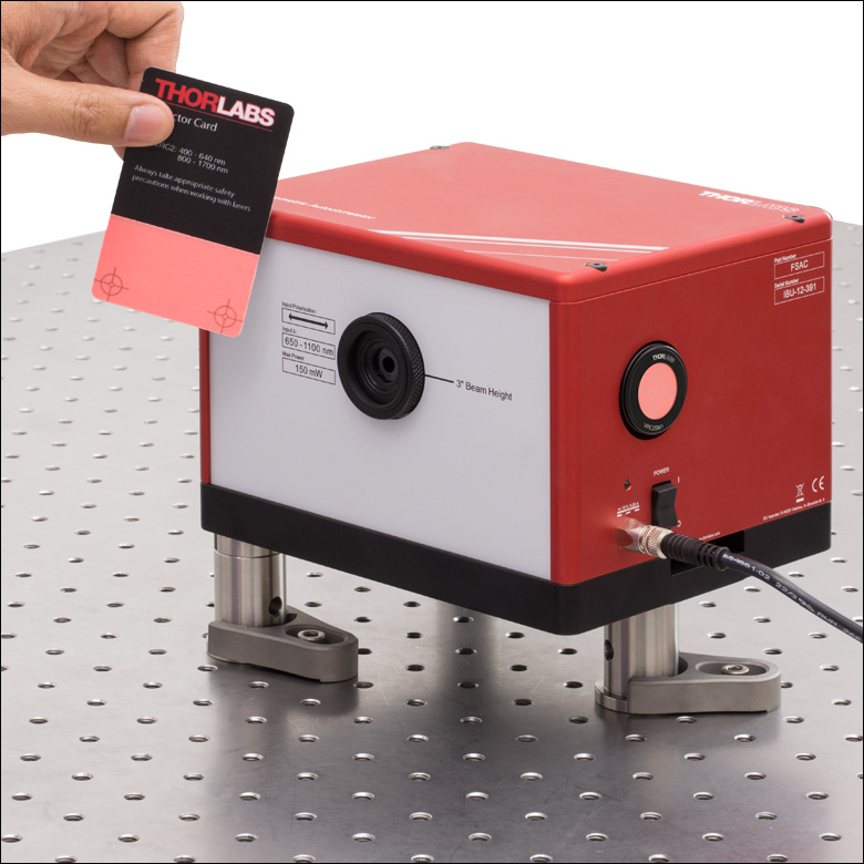 The FSAC autocorrelator is compatible with horizontally polarized input beams up to Ø4 mm (1/e2) and has a beam height of 3" (76.2 mm). A permanently installed SM1D12D Ring-Actuated Iris and an internally SM1-threaded side port provide two reference points for optical alignment. We include a VRC2SM1 Alignment Target and an SM1CP2 End Cap for this side port. To align, simply insert the FSAC into the beam path and rotate until the beam is centered on the target. A flip mount may be used to pick off the beam for regular diagnostics.