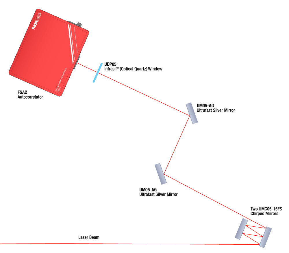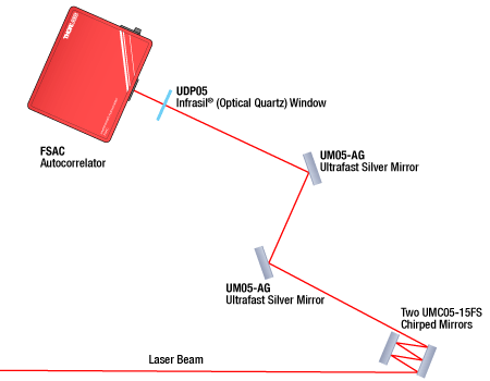 It is important to note that the pulse width measured by the unit is obtained immediately before the photodiode. Thorlabs' Chirped Mirrors may be used to compensate for dispersion in the optical path. The group delay dispersion caused by the FSAC's internal optics is nominally 230 fs2 at 800 nm. Pulses as short as 40 fs FWHM can typically be measured without precompensation, but sub-40 fs FWHM pulses will require it. See the Precompensation tab for more details.