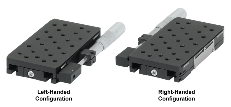 Figure G1.1 The side-mounted micrometer can be swapped with the locking plate to create either left- or right-handed stages. See the Micrometer Conversion tab for more details.