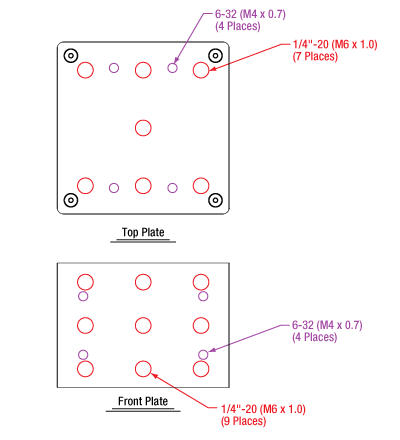The tapped mounting plate included in each assembly kit contains a similar 1/4"-20 (M6 x 1.0) tapped hole pattern as the top plate of the stages, but with one additional hole for a total of eighteen.