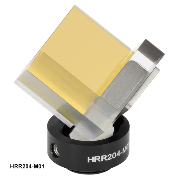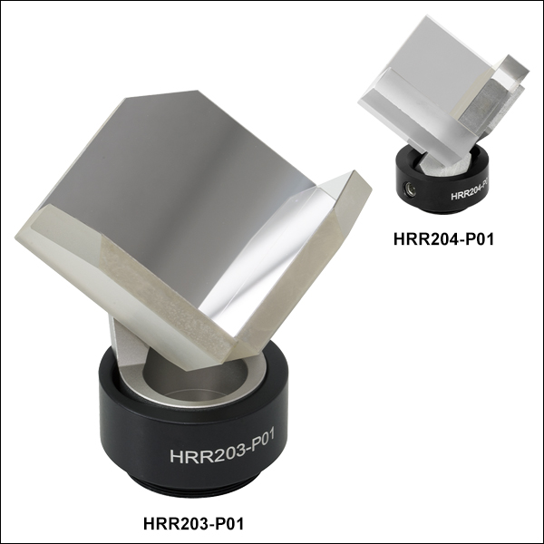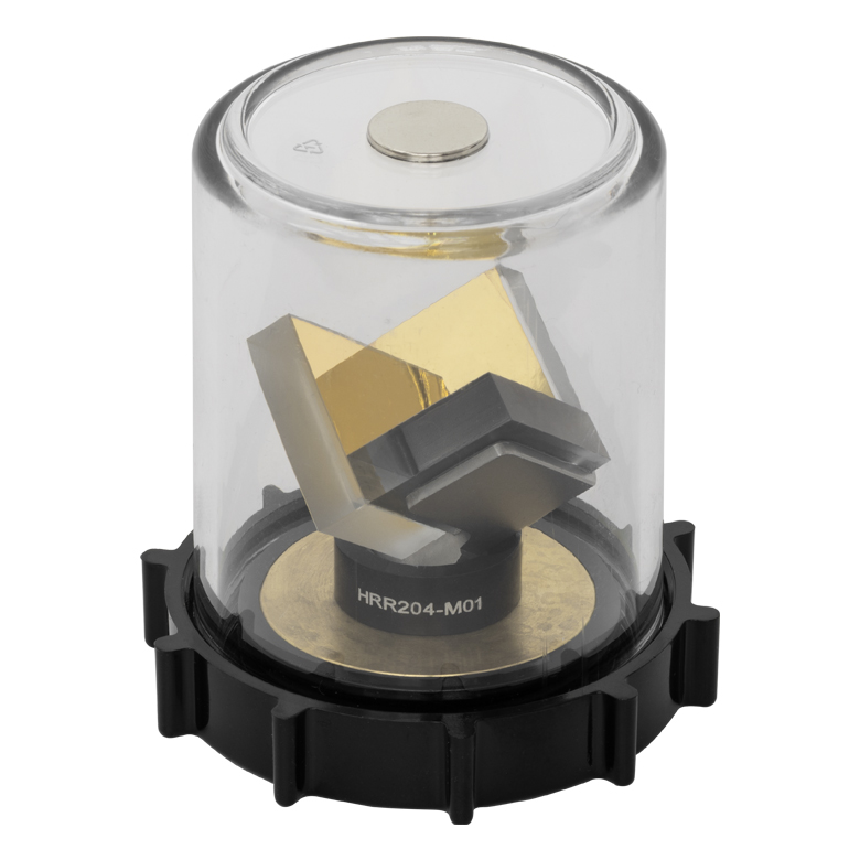 These hollow retroreflector mirrors are constructed using three substrates of either N-BK7 or UV fused silica. A UV-enhanced aluminum, protected silver, protected gold, or unprotected gold coating is applied on the polished faces. Each mirror is mounted in an engraved adapter that has either external SM05 (0.535"-40) or SM1 (1.035"-40) threads for compatibility with SM05- or SM1-threaded mounts. The robust corner cube construction, rotational symmetry, and stability result in low beam deviation of <20 arcsec. Each mirror with an SM05-threaded mount is shipped inside one of our objective containers for protection and storage; please refer to Figure 1.1 for details. Retroreflectors with SM1-threaded mounts are shipped in a unique container to accommodate the mount size; please refer to the product photos of Item #'s HRR203-F01, HRR203-P01, or HRR203-M03 for details. Thorlabs also offers unmounted, replicated aluminum hollow retroreflector mirrors with the same reflection geometry.