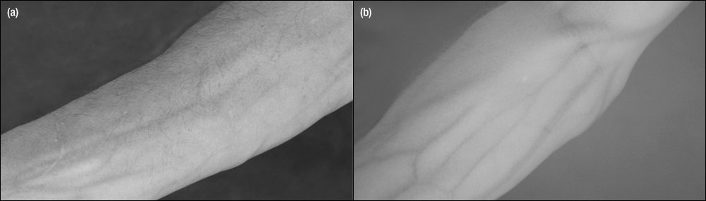 Figure G1.1 Images of an arm taken using a Kiralux NIR-Enhanced 1.3 MP CMOS Camera with a shortpass filter (a) or longpass filter (b). The left image (a) shows the arm's surface, while the veins beneath the skin are clearly visible in the NIR image (b).