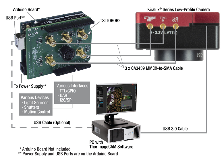 Figure G10.1 shows a schematic of a configuration with the TSI-IOBOB2 with an Arduino board integrated into a camera imaging system. The camera is connected to the break-out board using a 8050-CAB1 cable that must be purchased separately. The pins on the shield can be used to deliver signals to simultaneously control other peripheral devices, such as light sources, shutters, or motion control devices. Once the control program is written to the Arduino board, the USB connection to the host PC can be removed, allowing for a stand-alone system control platform; alternately, the USB connection can be left in place to allow for two-way communication between the Arduino and the PC. A similar setup can be configured for the LP series low-profile cameras using three CA3439 MMCX-to-SMA cables, sold separately. Please see the Triggering tab for more details on connecting the Compact Series and Low-Profile series cameras to the TSI-IOBOB2 and other external devices. The compact size of 2.70" x 2.10" (68.6 mm x 53.3 mm) also aids in keeping systems based on the TSI-IOBOB2 compact.