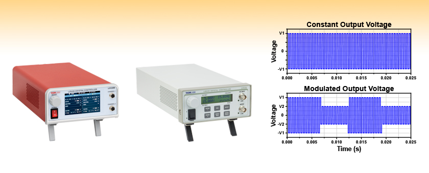 The LCC25 and LCC25D liquid crystal controllers are compatible all of our liquid crystal (LC) devices (see Table 1.1). Both controllers produce a square-wave AC voltage output with an amplitude that can be varied from 0 Vrms to ±25 Vrms. The LCC25 controller outputs a 2000 Hz square wave while the LCC25D controller's output is adjustable from 500 Hz to 10 kHz with 1 Hz resolution. Nematic LC retarders must be driven with an AC voltage in order to prevent the separation and build up of charge, which can cause the device to burn out. Additionally, each controller automatically zeros the DC bias across the LC device to within 10 mV in order to counteract the buildup of charges.