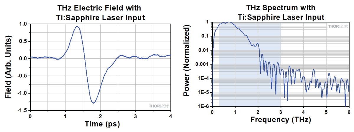 (posted 2024-11-04 04:46:13.0) Thanks for reaching out to us. The antenna requires a focused, linearly polarized, femtosecond laser pulse input with wavelengths centered around 800 nm. The acceptable wavelength range is from 650 nm to 850 nm. We've listed some additional requirements for the laser in the Specs table above, including average power, average laser intensity, fluence, beam diameter, and pulse duration. The recommended pulse duration is <100fs. You can see some example spectra of THz signal (with two different fs input pulses) under Graphs tab above. Note that shorter pulses usually generate broader THz spectra. We have reached out directly to discuss your application in further detail. |