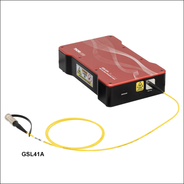 The drive electronics and temperature control circuits for the laser diode are integrated into each device and are powered by an included DS15 power supply with a region-specific plug. Item # GSL41A has an FC/PC fiber pigtail output. The other GSL series lasers have an FC/APC connector on the front panel for the output. The single-mode fiber-coupled output of the GSL series lasers allows for integration with a wide range of fiber-terminated devices.