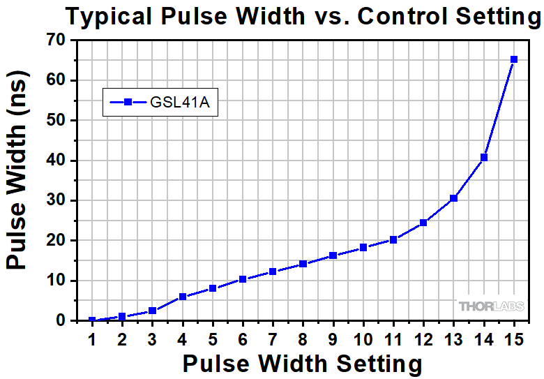 Each GSL series laser offers a control for varying the pulse width between picosecond operation (<130 ps), nanosecond operation adjustable over 14 discrete settings (1 to 65 ns), and continuous wave operation. Single shot operation is also available for pulse widths ≥6 ns. The pulse width control, located on the back panel, directly programs the pulse generator and can be adjusted to one of 16 positions using the included 2.5 mm screwdriver. Plots of typical pulse waveforms and typical pulse width as a function of the pulse width control setting are available in the Specs tab.