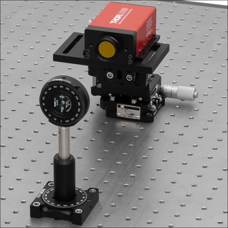 Thorlabs recommends mounting these crystals in an RSP1(/M) rotation mount attached to a manual rotation stage, such as our XRNR1(/M) or RP01(/M) stages, as seen in Figure 1.1. When the crystal's housing is installed in the RSP1(/M) mount, the crystal will be centered over the 8-32 (M4) threaded hole in the bottom of the mount without the need to use spacers or additional retaining rings. This allows the crystal to be centered on the RP01(/M) rotation stage, which provides the fine control needed to optimize the phase matching angle by adjusting the angle of incidence. In this example case, the crystal is oriented for a horizontally polarized input pump beam.