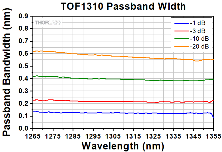 Figure 3.3 The passband width of the TOF1310 versus wavelength measured for -1, -3, -10, and -20 dB attenuation.