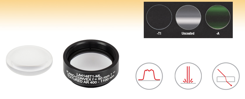 The low reflection textured surface on these plano-convex lenses is particularly desirable for applications with multiple optical elements. Since approximately 4% of the incident light is reflected at each surface of an uncoated substrate, the addition of an anti-reflection textured surface improves transmission, which is particularly important in low-light applications, and prevents the undesirable effects (e.g., ghost images) associated with multiple reflections.