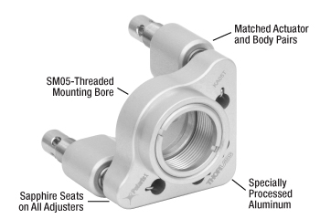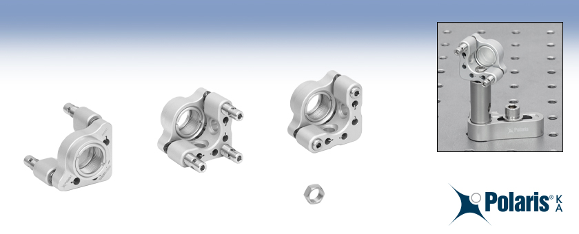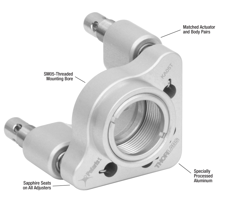 Machined from aged, lightweight 7075 aluminum alloy, PolarisKA mounts utilize precision-matched adjusters with ball contacts and sapphire seats to provide smooth kinematic adjustment. As shown on the Test Data tab, these mounts have undergone extensive testing to ensure high-quality performance. The Polaris design addresses all of the common causes of beam misalignment; please refer to the Design Features tab for detailed information.