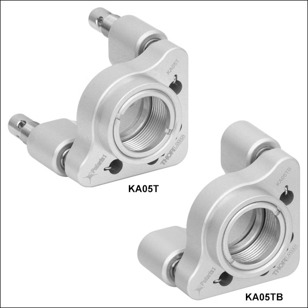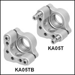 The KA05T and KA05TB 2-Adjuster SM05-Threaded Ø1/2" PolarisKA Kinematic Mirror Mounts are similar to the standard 3-adjuster versions sold above but feature a hardened steel ball in place of the third adjuster. The 2-adjuster design improves mount stability by limiting the available degrees of freedom for movement, making these mounts ideal solutions for OEM applications that require reliable operation in rugged environments. Each mount features an SM05-threaded (0.535"-40) bore for mounting Ø1/2" optics up to 0.25" (6.4 mm) thick or SM05-threaded components.