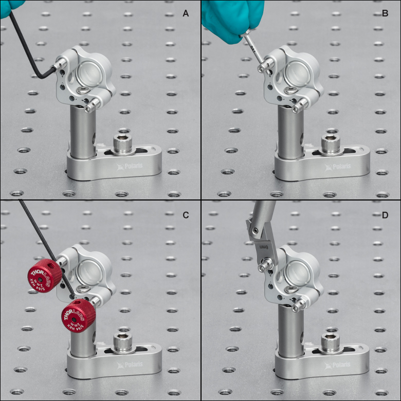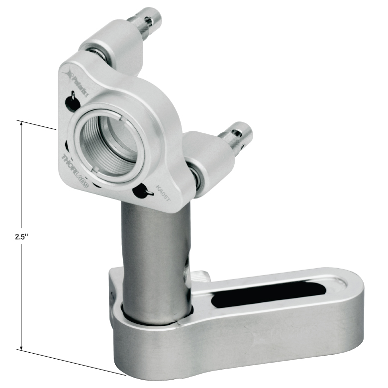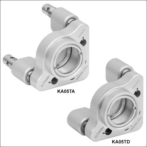 For fitting into tight spaces, the KA05TD mount is equipped with low-profile hex adjusters that are 0.33" (8.4 mm) shorter than the adjusters on the KA05TA; due to the shorter adjusters, the KA05TD mount cannot be used with LN19100H lock nuts. The hex actuators are compatible with 5/64" (2.0 mm) hex keys and may be adjusted with our HKTS-5/64 Hex Key Thumbscrew (sold below) or any other 5/64" (2.0 mm) hex wrench.