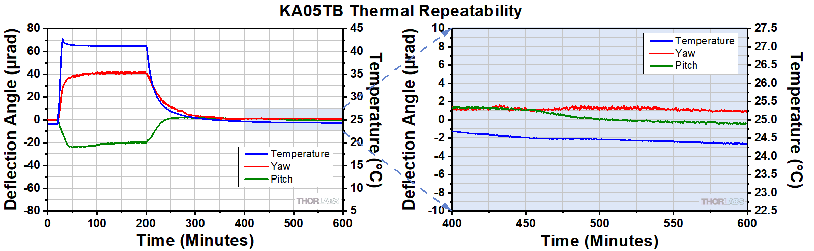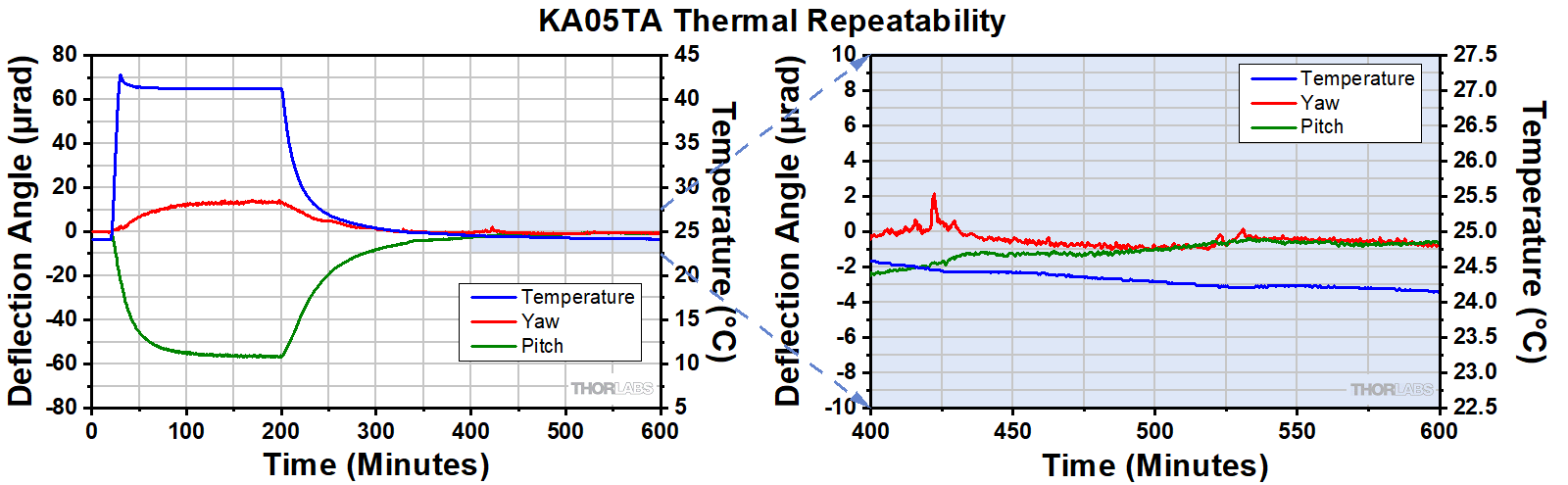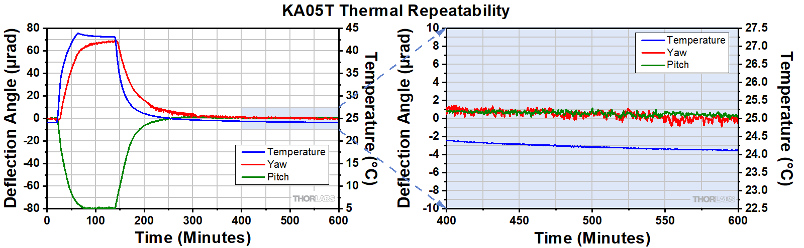 The temperature in most labs is not constant due to factors such as air conditioning, the number of people in the room, and the operating states of equipment. Thus, it is necessary that all mounts used in an alignment-sensitive optical setup be designed to minimize any thermally induced alignment effects. All the critical components of the PolarisKA series mirror mounts are made from specially selected dimensionally stable materials, such as low stress aged round 7075 aluminum bar stock to reduce internal stresses that can cause temperature-dependent hysteresis and optimal material tempers to improve the material stiffness and strength. As a result, the alignment of the optical system will be restored when the temperature of the mirror mount is returned to the initial temperature.