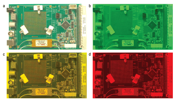 Figure 1.3 An OSW22-633E optical switch kit is imaged using a CS165CU1 camera with an MVL8M23 lens and a series of machine vision filters to highlight different features. The images were taken with (a) no filter, (b) an MVF52A filter, (c) an MVF58A filter, and (d) an MVF66A filter.