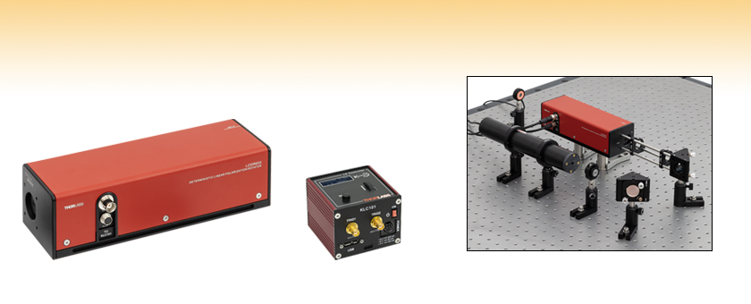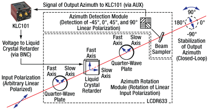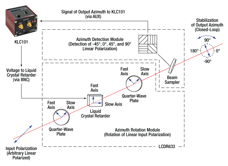 Thorlabs' LCDR633 Liquid Crystal Deterministic Rotator (LCDR), controlled by the KLC101 Liquid Crystal Controller, can continuously rotate the polarization state of an arbitrary linearly polarized input beam through over 360° with no mechanical movement involved. An internal closed-loop feedback mechanism analyzes the output beam and adjusts the driving voltage of the liquid crystal retarder to stabilize the output azimuth (as illustrated in Figure 1.2).
