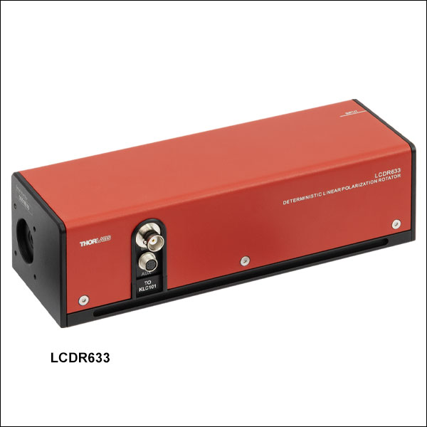 Thorlabs' LCDR633 Liquid Crystal Polarization Rotator accepts arbitrarily linearly polarized light and can rotate the output polarization through >360°. A feedback mechanism detects and stabilizes the azimuth of the output light. The rotator includes 1.5 m long BNC and Hirose cables for use with the KLC101 LC controller, which is required and sold separately below. The KLC101 controller that is used must be manufactured in 2025 or later (serial numbers larger than 39486044) and use firmware version 1.14.64 or higher. Earlier versions of this controller or those with older firmware will not function properly with the LCDR633 polarization rotator.