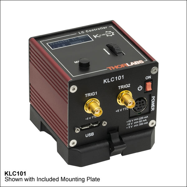 Thorlabs' KLC101 K-Cube Liquid Crystal Controller provides control of the LCDR633 liquid crystal polarization rotator and other liquid crystal devices. The digital display and controls on the top panel can be used to locally set the output voltage amplitude and frequency. The digital display includes a backlight that can be dimmed or turned off using the top panel menu options. Alternatively, a USB port allows the unit to be connected to a computer and controlled using the LCDR software (available in the Software tab above).