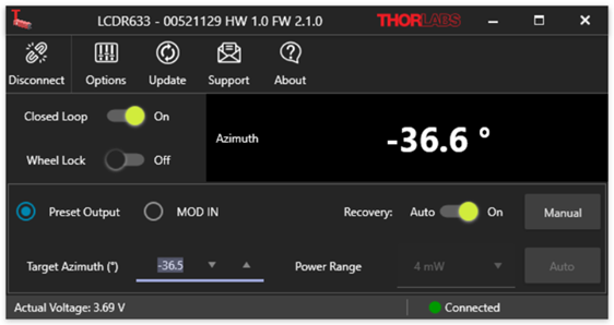 The LCDR software user interface allows full control of the LCDR633 rotator's set azimuth, closed-loop feedback, and other settings. These settings can also be accessed from the KLC101 top panel.
