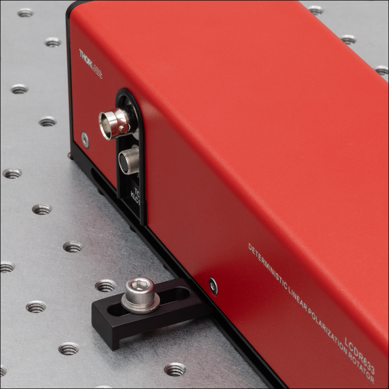 The LCDR features pairs of M4 x 0.7 and 8-32 mounting holes on either the bottom or side of the rotator housing for mounting to Ø1/2" optical posts or Ø1" pedestal posts. There are two sets on the bottom of the housing, one set centered on the housing and one set centered on the optical axis. The side-located mounting holes are ideal for spatially constrained systems where cable protrusion out of the side of the rotator is undesirable (in this case, the cables would connect to the top surface). Alternatively, two slots on either side of the rotator housing allow the LCDR to be mounted directly to an optical table with table clamps, such as our CL6 clamps (not included), as shown in Figure 1.4, resulting in a minimum beam height of 28.0 mm (1.10") while minimizing vibration and drift.