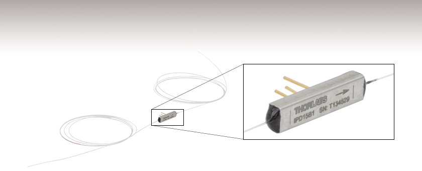 Thorlabs' Inline Photodetectors are used for real-time monitoring of the optical power being transmitted through a fiber. These photodetectors monitor in-line power by diverting a controlled amount of light from the fiber core through a secondary waveguide. The waveguide directionally diverts the tapped light to an InGaAs photodiode preventing back reflections from the detector propagating back into the fiber. The waveguide is inscribed into the fiber at an angle to the optical axis with a femtosecond laser.