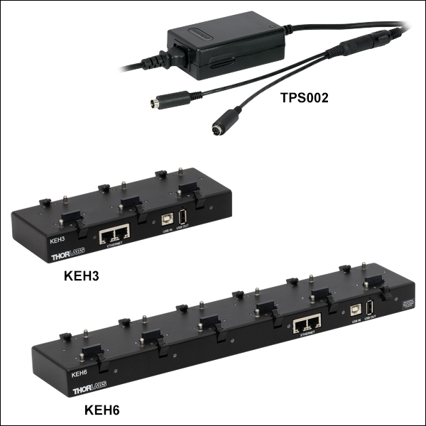 The TPS002 Power Supply Unit should only be used to power a single KNA-VIS or KNA-IR unit to avoid exceeding current limitations. The KEH3 and KEH6 Ethernet and USB Controller Hubs, available below, are ideal for applications involving multiple K-Cubes, and feature either three (Item # KEH3) or six (Item # KEH6) controller mounting bays. These K-Cube NanoTrak controllers occupy two mounting bays, so the KEH6 hub can be used to power multiple K-Cube NanoTrak controllers. All compatible power supply options can be found below.