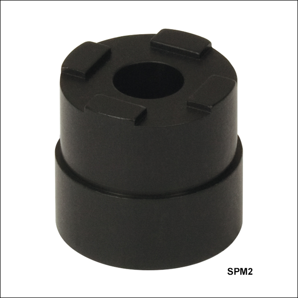 The SPM2 Prism Mount is designed to hold a prism up to 10 mm tall in a SC6W 16 mm Cage Cube or any cage mount with a Ø0.64" (Ø16.1 mm) smooth aperture. Optics can be secured using an adhesive, such as epoxy. Once the optic is mounted within the cage cube, the mount can rotate 360° to provide coarse adjustment. The SPM2's drilled center hole allows a laser beam to pass through the mount. After establishing the desired position, lock the mount into place using the 4-40 nylon-tipped setscrew.