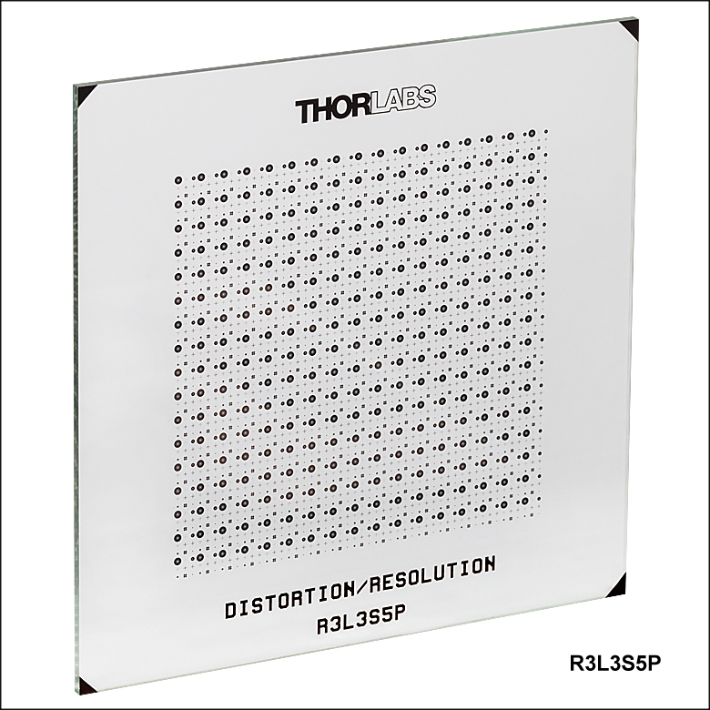 Thorlabs offers a variety of options for measuring the distortion of an optical system including targets with a single-frequency grid, multi-frequency grids, or distortion grids alongside a wide variety of other patterns for resolution measurement, calibration, and more. Combined, these targets offer grid spacings ranging from 2 µm to 5000 µm.