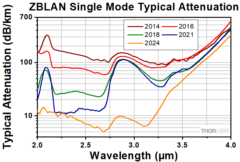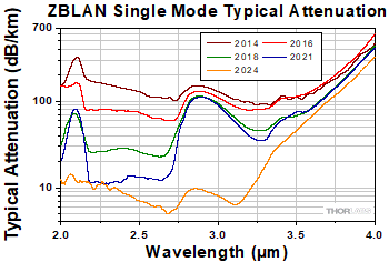 Thorlabs' team of MIR fiber researchers and engineers has many years of experience in fluoride glass research and development, production, and fiber draw. Their knowledge and expertise have resulted in consistent improvement in the quality of our fluoride fiber. See Figures 8.4 and 8.5 for the progression of our fluoride fiber performance.