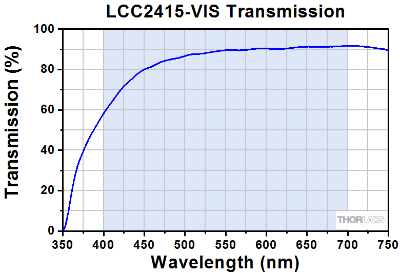 Figure 3.2 The shaded region in this plot indicates the LCC2415-VIS's design wavelength range.