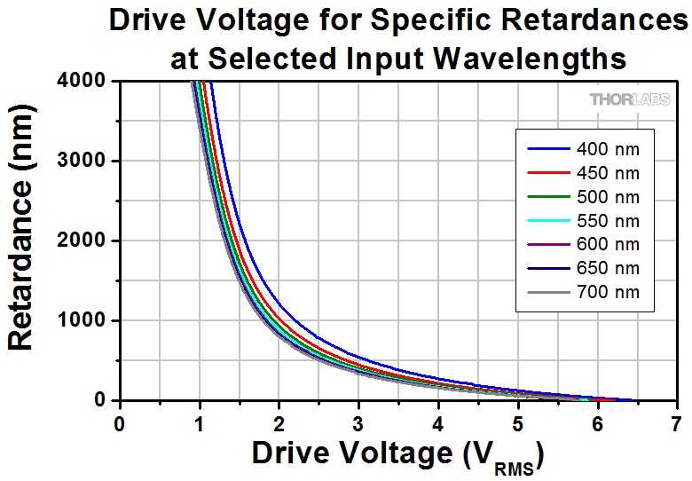 These plots were obtained using a typical retarder unit; the actual performance will vary from unit to unit. All units are factory calibrated before shipment so that they will provide retardance of 0 nm to 4000 nm (±1%) for input wavelengths in the 400 - 700 nm range when operated from the included software. The unit-specific calibration data is available upon request.