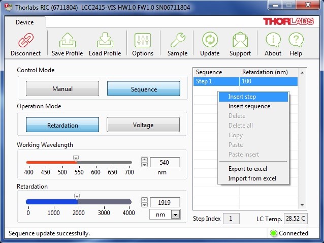 The included Windows® software package allows the user to set the retardance (in units of waves, degrees, or nm) or the voltage across the liquid crystal cell (0 V to 10 V, with 0.2 mV resolution). For retardance sequences, the user needs to supply an external trigger signal (5 V TTL) through the female SMC connector on the housing (see Figure 1.2) to advance from step to step; the step will occur on the falling edge of the TTL signal. An SMC cable, sold separately, is required to trigger a sequence.