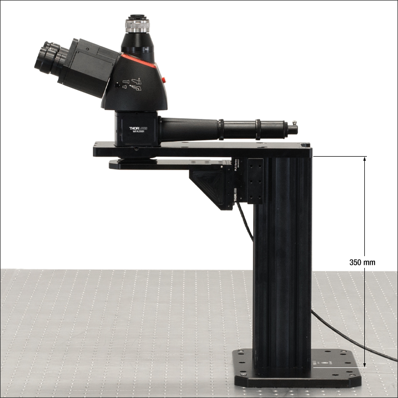 The backbone of this microscope is the 350 mm tall microscope body based on Thorlabs' 95 mm Precision Optical Rails, providing stable long-term support and excellent vibrational damping. Its linear dovetail mounting surface allows modules to be removed when they are not needed, freeing additional workspace and opening the door to user customization. For alternate rail heights, please see the full web presentation.